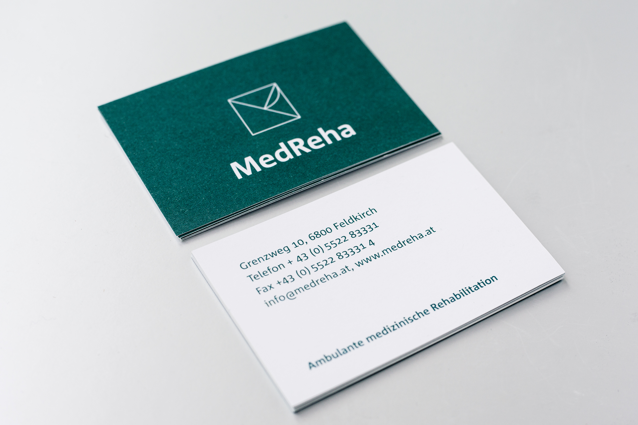 Eine tiefgreifende Thematik braucht ein beruhigtes Design. Die Gestaltung für MedReha ist bewusst sehr reduziert, beinahe klinisch steril. Die Farbgebung bringt Ruhe in das Gesamtbild. Ein Konstruktionssystem aus Quadrat und Kreis hat die Gestaltung des Logos inspiriert. In aller Klarheit und Deutlichkeit. Einfach beruhigt reduziert.